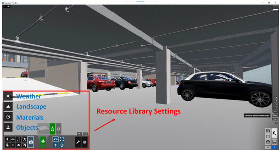 Lumion supports adding a variety of resources to simulate actual architectural effects. Figure 3 shows the settings of the resource library. Designers can adjust the parameters of weather, landscape, materials, and objects libraries to construct a visual representation of the building depending on the practical needs. To avoid format incompatibility between Revit and Lumion, the Lumion LiveSync for Autodesk Revit plug-in converts a DAE format for direct transfer [59]. Lumion’s effect display for the exterior consists of images and videos. Based on the completed material layout of the framed model, it performs the image and video rendering editing. The image rendering editing process is to customize selected views to reach the target effect. Video rendering is the process of choosing frames to determine the animated content, adjusting the interval between frames to control the length of the video, and then rendering the visual product. Additionally, the version of Lumion in this study was Lumion 8.5.