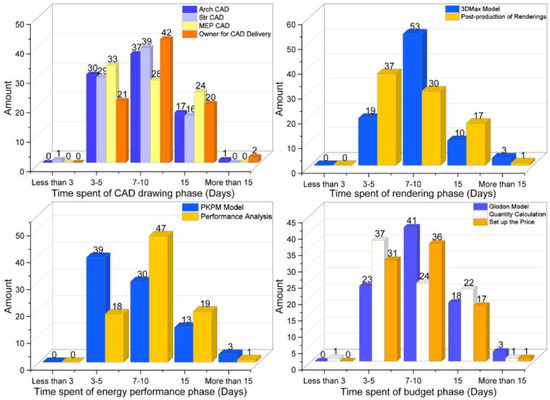 Questions 1–11 of the questionnaire measured the duration of the main phases of the traditional workflow. Figure 5 presents the feedback of the questionnaire. For the CAD drawing phase, 37 participants (43.5%) answered that the architectural CAD design takes about 10 days to complete, 39 participants (45.9%) indicated that the structural CAD design requires about 10 days, and 33 participants (38.8%) considered about 5 days for the MEP CAD design. There were 42 participants (49.4%) who reflected that the delivery of CAD documents to the client and receiving feedback takes approximately 7 days. For the rendering phase, 53 (62.4%) participants considered that the 3DMax modeling takes about 10 days, while 37 (43.5%) of the participants estimated that the post-rendering requires about 3 days to complete. For the energy performance phase, 39 (45.9%) participants answered that the time required for the PKPM modeling is approximately 5 days, while 47 (55.3%) participants indicated that the post-modeling performance analysis takes about 10 days to complete. For the budget phase, 41 (48.2%) participants estimated that it requires about 10 days to create the Glodon model, while 37 (43.5%) considered that the quantity calculation takes 3 days to complete. Meanwhile, 36 (42.4%) participants answered that it takes about 7 days to set the price for the list of quantities. The survey feedback data are presented as Questionnaire feedback.pdf linked to Mendeley data.
