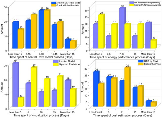 Questions 12–19 evaluated the duration of multiple processes of the BIM-assisted workflow, as shown in Figure 6. For the central Revit model process, 26 (30.6%) participants answered that the time required for the Arch-Str-MEP Revit model is about 30 days, while 26 (30.6%) participants indicated that the model review with specialists takes approximately 7 days. For the energy performance process, 30 (35.3%) participants estimated that it requires about 10 days to perform the Grasshopper parametric programming, while 25 (29.4%) considered that the energy performance analysis takes 2 days to complete. For the visualization process, there were 30 participants (35.3%) who reflected that the creation of the Lumion model spends approximately 4 days, while 27 participants (31.8%) answered that the Synchro Pro model takes about 5 days to construct. For the cost estimation process, 26 (30.6%) participants considered that the quantity calculation by Revit takes about 2 days, while 29 (34.1%) of the participants estimated that it takes approximately 7 days to set up the price.
