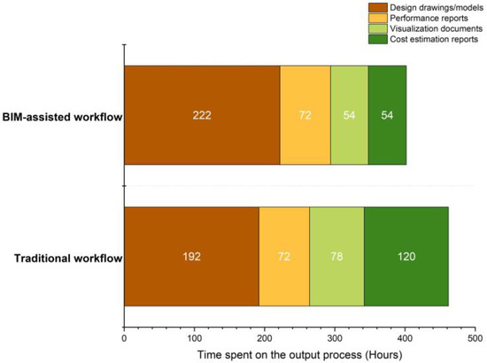 The comparison results also allow observing the time spent difference for each process of both workflows. The design drawings/models of the traditional workflow consumed 192 h, in contrast to 222 h for the BIM-assisted workflow, which took 30 h more. The time taken for the performance reports in the traditional workflow was the same as the BIM-assisted workflow: both 72 h. The BIM-assisted workflow consumed 54 h to produce the visualization documents compared to 78 h for the traditional workflow. The traditional workflow spent almost 1.5 times as long as the BIM-assisted workflow in the visualization process. The calculation of the cost estimate reports in the traditional workflow took 120 h, while the BIM-assisted workflow was just 54 h. The time required for BIM to evaluate costs was 55% less than the process in the traditional workflow. Thus, it is initially evident that the BIM-assisted workflow outperforms the traditional workflow efficiency.