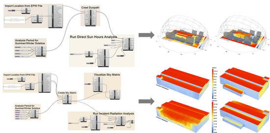 Incident radiation analysis enables the evaluation of the extent to which buildings are affected by solar radiation. The weather data and study period were delivered from ImportEPW and AnalysisPeriod to SkyMatrix. Furthermore, SkyMatrix was linked to SkyDome and IncidentRadiation, respectively. With LegendPar, Scale, and additional parameters set, SkyDome derived the total radiation distribution, and IncidentRadiation produced the radiation impact results for the building.