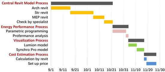 The BIM-assisted workflow was measured in its time consumption in a practical operation that aims to validate the credibility of the survey results. In Figure 12, the simulation operated from September 1 to November 26. The working days in the period were Monday to Friday, and each working day was calculated in 6 h units.