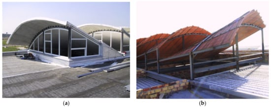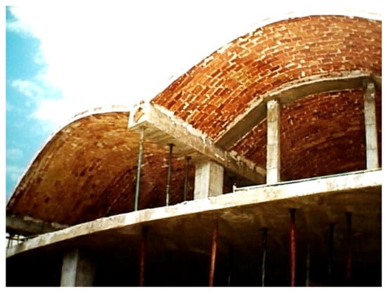 Although strictly speaking not a conoid, because its equation differs from what we have explained above, the cover of a fan-shaped plan with this kind of surface offers a very interesting structural property: the larger spans between pillars are covered by arches, while the tapered end of the trapeze features a common slab or planar beam, which seems very logical from a constructive point of view []. In this way, the shells’ materials can be lighter and smoother. The result has proven to provide increased insulation and adds a variety of light effects.