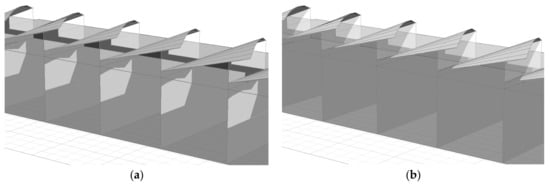 Based on the former, we have created different design alternatives in time, to introduce sunlight into the core of buildings that could perform satisfactorily for residential facilities. The main output is based on conoidal shapes. The more evolved alternative for advanced skylights is presented in Figure 1, in which the glazed parts instead of being planar are also conoids. Bearing in mind the problems of heat and light transfer, this feature presents undoubted advantages []. Firstly, the glazing is better shaded and protected by the opaque upper surface. Secondly, sunlight and heat transmission are modulated by the smooth curves conjoined to the innovative glass properties. In this way, the glass surface becomes load-bearing and collaborates with the general structure. The form can be easily adapted to arrays of skylights (Figure 2).