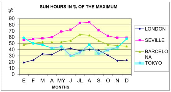 The sunlight distribution by months, in terms of percentage, at four different locations: London, Seville, Barcelona, and Tokyo.