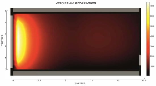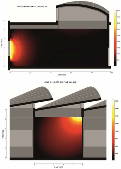 We show below some of the most relevant computer results of the simulations (Figure 10 and Figure 11). Horizontal daylighting values refer to a reference plane located 0.6 m above the floor. The sectional views cut across the loft units through their center point. Notice that the grid points are taken every 1 m in the width, length, and height axes.