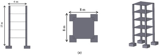 The prototype selected for testing purposes is a conventional building system whose characteristics are shown in Table 1. The building is a typical five-story concrete moment-resisting frame. Its height and width are 15 and 6 m, respectively. The central lines of the columns are 5.5 m apart in two directions. The lateral dimension of the concrete slab of the floors is 6 m and its thickness is 0.15 m. The dimensions of the column cross-section are 0.5 × 0.5 m and the net center to center height is 3 m. The building is resting on single footings that are 2 m wide, 2 m long and 1 m thick, as shown in Figure 1. It should be noted, that the conventional buildings with ordinary floor dimensions have the first local bending mode frequency of the slab in the range of 8–16 Hz [,].