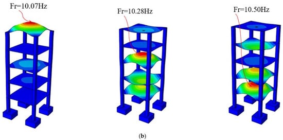 Resonance frequencies of the slabs were found from the peaks in the frequency domain. The experimental assessment focused on the mode shapes and natural frequencies of the structure associated with the bending mode of slabs []. The resonance points in the frequency content of the first-, third- and fifth-floor responses signified the frequencies 48, 47 and 45 Hz in descending order. The peaks on the diagram imply the natural frequency of the slabs corresponding to the slab local bending mode. The amplitude of the resonance frequency of the first floor had the highest value. The reason is that the natural frequency of the slab was close to the dominant frequency associated with the vibration mode of the soil’s vertical motion. Moreover, at a frequency of 49 Hz, a peak with a smaller amplitude could be seen on the green line related to the first floor, which is the peak associated with the soil.