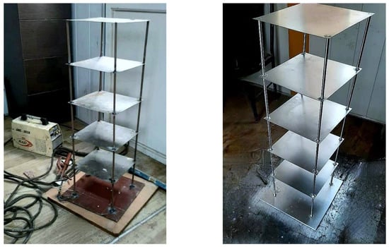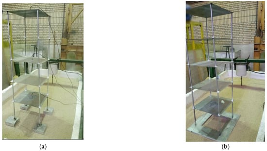 where and are, respectively, the plate bending stiffness and thickness. Additionally, ,, and are the column bending stiffness, moment of inertia, and length, respectively. The columns and floors are joined by welds. It is known that the foundation type does not affect the slab bending mode frequency []. After the numerical modeling and design iterations, the adequate structural model was constructed in the laboratory, as summed up in Table 5 and shown in Figure 2.