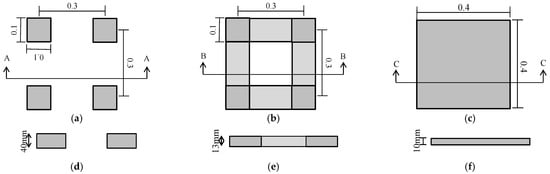 Schematic representation of studied foundations: (a) single foundation, (b) strip foundation, (c) mat foundation, (d) A–A cross section, (e) B–B cross section, and (f) C–C cross section.