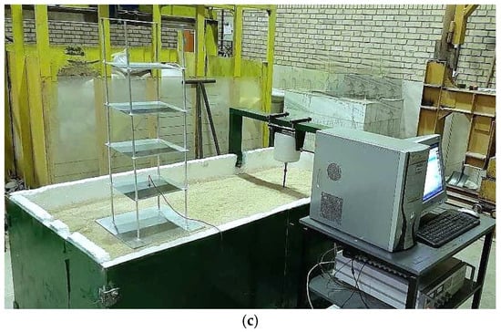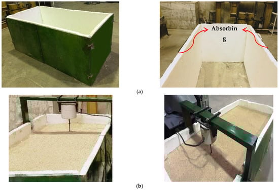In the present study, a physical model was constructed around a rigid steel container. Its width, length and height were 2, 1, and 0.8 m, respectively []. To reduce the reflected surface waves from boundaries, soft materials consisting of conventional foams with proper dimensions and a thickness of 50 mm were installed on the sidewalls of the container, as seen in Figure 4.