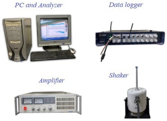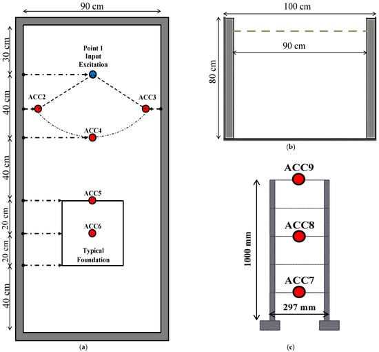 As observed in Figure 6, an array of uniaxial accelerometers was installed at respective points of the model to measure the dynamic response of the soil and structure. To evaluate the efficacy of absorbing foams, three accelerometers, ACC2, ACC3, and ACC4, were placed on the soil surface at constant distances of 40 cm from the input load point on the perimeter of a circle. Furthermore, ACC5 and ACC6 were situated at regular intervals from the load point and in the midline of the soil container (at the same distances from the sidewalls). Finally, ACC7, ACC8, and ACC9 were located at the midpoint of the floor slabs. An electromagnetic shaker was utilized to induce dynamic vibrations, as seen in to Figure 4 and Figure 5. The complete collection of the setup instruments is provided in Figure 7 including the computer, data logger, amplifier, and shaker. The data acquisition system was ECON AVANT MI-7016 [], and the sensors specifications are summarized in Table 8.