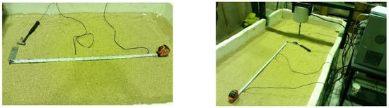 As specified above, a box with the dimensions 2 × 1 × 0.8 m was used for the construction of the test model. Assuming bedrock at the depth of 14 m, the test box was filled to a height of 70 cm. The dry sand was poured into layers of 10 cm thickness, and each layer was compacted by a laboratory roller and vibrator. During the compaction of each layer, the dry density was measured continuously to ensure a relative density of 70%. Figure 5 illustrates the scaled structure with various foundations on the soil [].