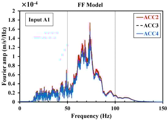 As indicated in Section 2.6, the performance of the absorbing boundaries can be evaluated by placing ACC2, ACC3, and ACC4 at the same distance of 40 cm on a circular perimeter with the center being the load point. According to Figure 11, no matter where the location of the accelerometers was, the foams performed efficiently as absorbing boundaries since the Fourier amplitude did not change in the three positions. One concludes that the waves reflected from the end walls did not affect the FF response, which is in good agreement with previously conducted research [].