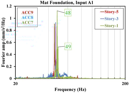 This section evaluates the fundamental frequencies concerning the bending mode of the floor slab in the scaled model. Initially, to confirm what is described in Section 2.2.1, load type A1 was applied to the soil in the presence of the structure on the mat foundation, and the outputs of ACC7 to ACC9 were acquired. Additionally, the frequency response of the first, third, and fifth slabs was calculated, as seen in Figure 12. The response of the floors is dominated by first local bending modes [].