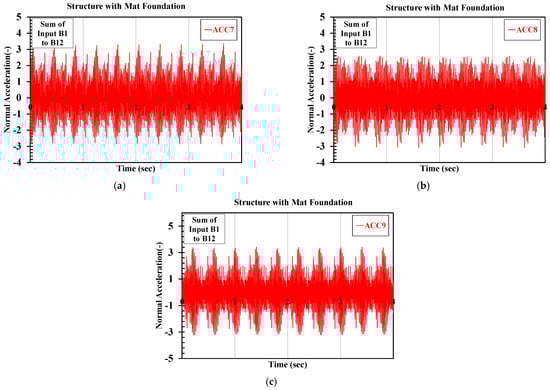 The sinusoidal load types B1 to B12 as presented in Table 9 were applied using the shaker at a distance of 100 cm from the center of the experimental scaled structure with a mat foundation while ACC7, ACC8 and ACC9 measured the acceleration data of the first, third and fifth floors, respectively. Next, each time history was divided by its absolute maximum value to become normalized in terms of amplitude. These normal accelerations were added in accordance with the superposition principle, shown in Figure 13. Finally, the frequency response was acquired which is shown in Figure 14. For a detailed view, 4 s of the acceleration time history are presented in Figure 13; however, the test data have been recorded for up to 6 s.
