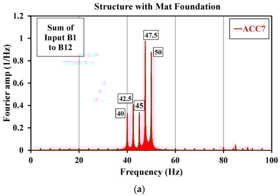 Figure 13a–c display the time history of normal accelerations. In Figure 14a–c, the peak of the frequency response diagram is detectable around 45 and 47.5 Hz at the fifth, third and first slabs, respectively, confirming the occurrence of the resonance at the frequency associated with the bending mode of slabs. Due to the closeness of the natural frequency of the first and third slabs to the frequency of the harmonic input at 47.5 Hz, these two frequencies are indiscernible. On the other hand, while the dominating frequencies of the vertical ground motion approach the local bending mode frequency of slabs, the Fourier amplitude increases at these resonance frequencies rationally.
