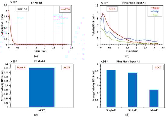According to previous studies, to examine the effect of foundation geometry on the received vibrations in the developed scaled structure, the impact of vibrations caused by the input type A1 on the first-floor slab should be studied. As the human body responds to the average amplitude of a signal, the root-mean-square (RMS) of the signal is used to inspect the vibration levels. The RMS value was used as a measure of the vibration magnitude for evaluation and comparison purposes []. To this end, as suggested by FTA regulations, the RMS for the velocity term was used to study the vertical vibrations [].