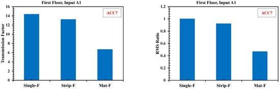 As mentioned above, three different foundations were considered. The weight of these foundations was almost kept constant throughout the tests. The values in column (4) of Table 10 indicate that the wave transmission factor (TRF)—obtained via dividing column (2) by column (3) in Table 10—in the structure with a mat foundation had the minimum value. This illustrates the proper performance of the mat foundation in comparison with other types, as depicted in Figure 15d and Figure 16. Furthermore, the values of column (5) imply that the RMS Ratio (RR)—column (2) divided by the array of column (2), row (2) in Table 10—was also significantly reduced in the structure with a mat foundation. It was the corollary of the uniform performance of this foundation type according to Figure 16. The values of column (4) exceed unity due to the approaching natural frequency of the slab local bending mode to the dominant frequency associated with the vertical translation mode of soil. This issue has culminated in the appearance of resonance and, consequently, the growth of TRF.