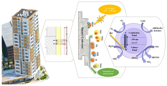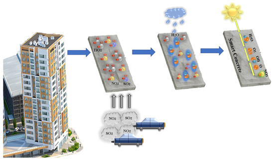All this leads to increased scientific interest in recent years in the issues of environmental safety and sustainable development of urbanized areas. Therefore, the actual direction is to develop, not only environmentally friendly materials and technologies for use in the construction of civil and industrial facilities, but also building materials that reduce the environmental load on urbanized areas [4,5,6]. To solve the problem of atmospheric air pollution, it is possible to use photocatalytic self-cleaning smart building materials that enable reducing the concentration of pollutants in the atmosphere with the simultaneous function of self-cleaning.