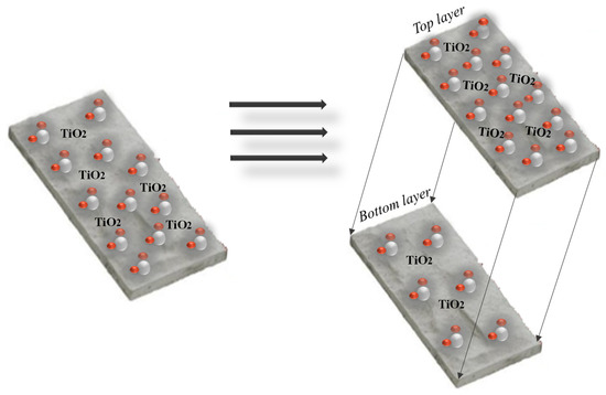 Summarizing the studied information [1,2,3,4,5,6,7,8,9,10,11,12,13,14,15,16,17,18,19,20,21,22,23,24,25,26,27,28,29,30,31,32,33,34,35,36,37,38,39,40], we can conclude that several methods of introducing titanium dioxide (n-TiO2) into a building material are currently known. The authors of the study propose the following explanation and classification: surface “Nano-titania outside,” internal “Nano-titania inside.” The former is based on the application and distribution of a prepared suspension containing n-TiO2 particles on the surface of the cured composite material. The latter is based on the introduction and dispersion of n-TiO2 powder in the matrix material in the process of composite preparation. It can be carried out directly in a cement batter or at a stage of introduction of aggregates, whereas the spraying of particles n-TiO2 was preliminarily carried out on the surface of aggregates. The advantages of the surface method “Nano-titania inside” can include a higher value of photocatalytic performance, but at the same time, a short duration of operation due to loss of photocatalyst particles. The advantages of the second method can include a longer period, but a lower photocatalytic performance of the building products. Thus, a relevant scientific direction is considered the development of a new way of introducing n-TiO2 particles, devoid of the shortcomings of existing methods and simultaneously retaining their advantages. To solve the problem, the authors propose to develop a hybrid method, “Nano-titania gradient,” which consists of forming a gradient of n-TiO2 particles concentration in the composite since the physical properties of the composite are always inextricably linked to the geometry. A schematic representation of the formation of the concentration gradient of n-TiO2 particles “Nano-titania gradient” in the facade concrete slab is shown in Figure 3. The proposed method will be thoroughly explained in Section 2.
