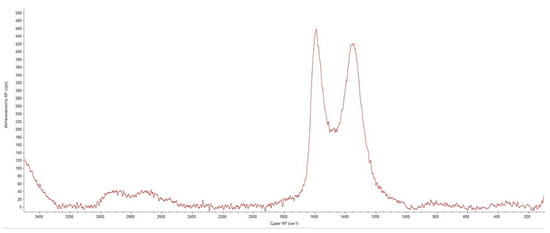 Surface sensitization of titanium dioxide was carried out by means of graphene oxide produced by LLC “NanoTechCenter”, Tambov, Russia. Graphene oxide was obtained using an original modification of the Hummers–Offeman method. The need to use sodium nitrate was eliminated. In the final product, the impurity of underexposed graphite was removed, which is usually present when producing graphene oxide using the classical Hummers–Offeman method. Graphene oxide is characterized by the data presented in Figure 4 and Figure 5.
