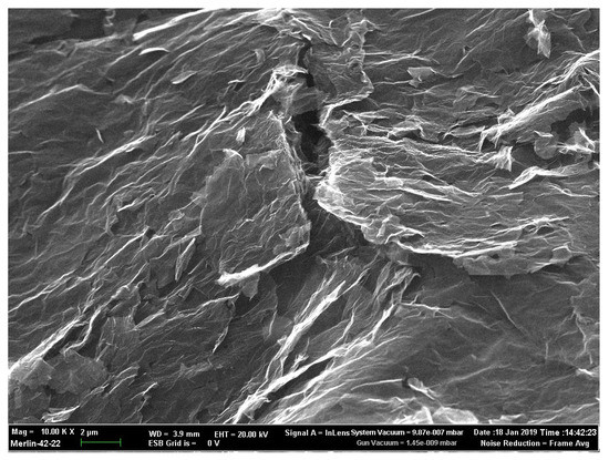 When analyzing the SEM Tescan MIRA3 LMU microscope by Tescam Orsay Holding, Brno, Czech Republic image of graphene oxide (Figure 5), we can conclude that its structure consists of scales of large lateral size, organized in the folds. According to the energy dispersive analysis, the air-dry product had the following elemental composition, taking the sum of C + O + S = 100% exclusive of other elements: carbon—54.6%, oxygen—43.5%; sulfur—1.9%. In the dry form, graphene oxide forms flexible, sufficiently strong films, consisting of tightly packed graphene-oxide layers oriented parallel to the substrate.