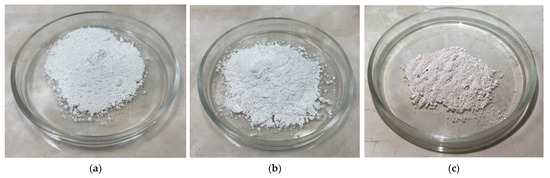 Appearance of the samples: (a) titanium dioxide; (b) titanium dioxide with graphene oxide after grinding; (c) titanium dioxide with graphene oxide after surface sensitization.