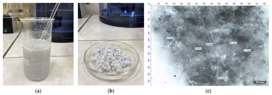 Appearance: (a) recoverable waste paper suspension; (b) dry residue of recoverable waste paper; (c) microstructure of dry residue of recoverable waste paper.