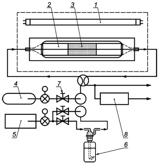 Determining frost resistance, that is, the resistance of concrete specimens to alternate freezing and thawing was conducted according to Russian state standard GOST 10060-2012. The specimens were saturated with water by immersion in water for 1/3 of their height for 24 h, then the water level was raised to 2/3 of the height of the specimens and kept in this state for another 24 h. After that, the specimens were fully plunged into the water for 48 h. The water-saturated specimens were removed and placed in a freezer. The specimens were frozen and thawed for at least 5 h (one cycle). The specimens were held for 15, 25 and 50 cycles. Determining photocatalytic activity in the decomposition (mineralization) reactions of nitrogen oxides and volatile organic compounds (VOC) was carried out according to Russian state standard GOST R 57255-2016. The method was based on the activation of the tested specimen placed in a flow-through photocatalytic reactor by irradiation with ultraviolet light, Figure 8.