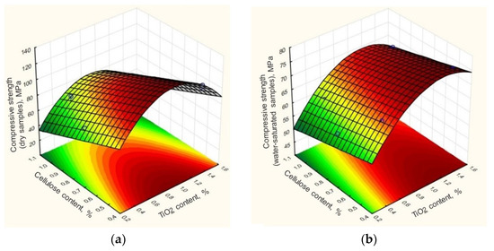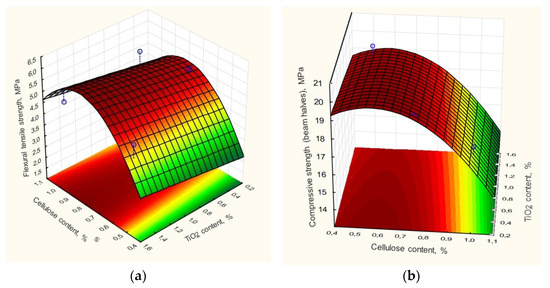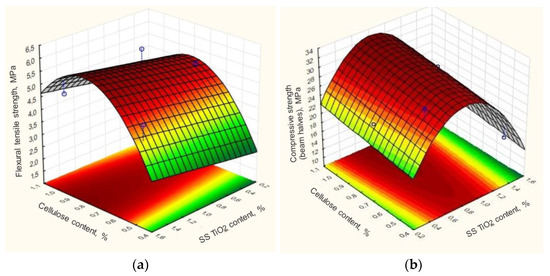When the concentration of cellulose fibers increases, the ultimate strength is decreased according to the linear law, which corresponds to the already known data on similar composites [50]. From the analysis of the experimental–statistical model of the ultimate compressive strength (Figure 9 and Figure 10), it can be concluded that the optimum content of TiO2 was in the range from 0.8 to 1.1%, and for cellulose from 0.4 to 0.8%, the optimum content of SS TiO2 was in the range from 0.7 to 1.1%, for cellulose—has not changed. From the analysis of the experimental and statistical model of the ultimate bending strength (Figure 11 and Figure 12), the optimal TiO2 and SS TiO2 content were between 0.6 and 1.0%, and between 0.4 and 0.8% for cellulose.