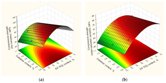 Based on the obtained results on the physical and mechanical characteristics, a mathematical model and surface response functions for the compressive strength in the dry and water-saturated state for cubic specimens with TiO2 (Figure 9), for cubic specimens with SS TiO2 (Figure 10), and on compression and tension in bending for prisms-samples with TiO2 (Figure 11), for prisms-samples with SS TiO2 (Figure 12) were made. On this basis, the limits of variation of the optimal content of additives “recoverable waste cellulose—TiO2/SS TiO2” in the composition to obtain effective photocatalytic composites were determined.