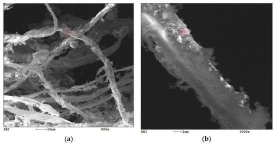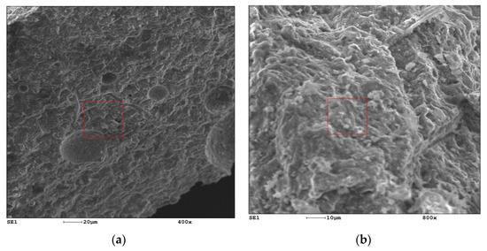 Microphotograph of cement mortar with recoverable waste cellulose and titanium dioxide, composition No9 aged 28 days, with magnification: (a) 400×, (b) 800×; The determination of the energy dispersive elemental analysis was carried out in the area of the red square.