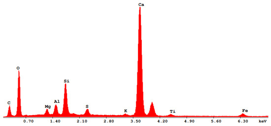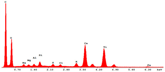 Due to the ability of cellulose fibers to swell in liquids, the surface of cellulose fibrils becomes more accessible to microparticles, which are evenly distributed within the fibers. The implemented microanalysis of components (Figure 16) shows that in addition to the formed calcium hydroxide, titanium dioxide is also present.