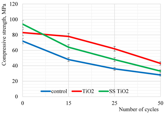 The increase by up to 33% of photocatalytic concrete resistance to repeated cyclic effects of alternating temperatures was explained by the complex influence of cellulose fibers and titanium dioxide. In the freshly prepared concrete mixture, the cellulose fibers were in a water-saturated state, which led to a significant increase in their volume. Subsequently, the hydration of cement caused the migration of water from the fibers with a subsequent decrease in volume. Due to this process, closed air pores (reserve cells) were formed and penetrated by capillaries after hydration. The pores formed in the space around the cellulose fibers were reserve cells that contained excess water from freezing and helped to compensate for the stress on their walls. At the same time, due to the water-solubility of titanium dioxide, there was additional compaction in the capillary pores of the concrete, which prevented the free movement of water and further restrained the saturation of air pores, increasing the frost resistance in the complex.