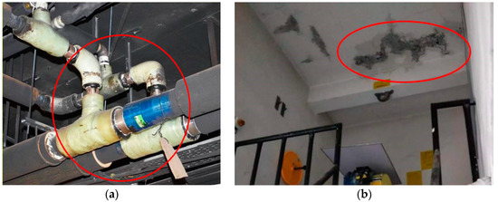 Common forms of damage to ACWS pipe networks: (a) leakage causes ACWS performance degradation; (b) ACWS water leakage causes mildew.