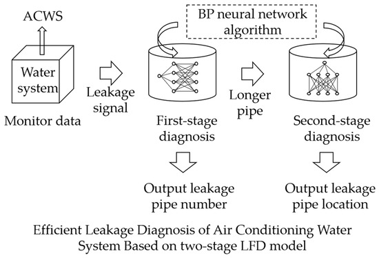 This paper proposes the possibility of applying an Adam-optimized BP neural network algorithm to the diagnosis of pipe leakage in ACWSs, establishes a simulated hydraulic model of pipe network leakage based on the Dymola platform (a kind of engineering modeling platform, detailed in Section 2.2.1), adopts the cuckoo search algorithm to identify the characteristics of the pipe network so as to ensure the reliability and accuracy of the simulation model, proposes a two-stage leakage diagnosis method with the Adam-optimized BP neural network—which not only locates the leaky pipe section, but also locates the exact leakage point on the pipe—and demonstrates the application of the method based on a practical project.