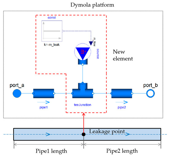 The Dymola platform is a multidisciplinary system modeling and simulation tool based on the Modelica language (an object-oriented physical modeling language) [19]. It has a library of models and simulation specialties suitable for multiple engineering domains, and has proven its applicability in the engineering field, while “Modelica.Fluid” provides the basis for developing the network hydraulic model. However, the existing components cannot meet the simulation under leakage conditions, so for this paper we developed a hydraulic model that can simulate different leakage conditions based on the Dymola platform.