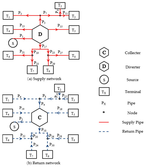 While there are a few studies on ACWS leakage diagnosis, this study focuses on the actual diagnosis effect of a BP neural network algorithm on the ACWS leakage problem. In addition, most of the pipe network LFD methods mentioned above regard the leaking pipe’s number as the final diagnosis result. When the leaking pipe is long, this causes problems with the diagnostic efficiency. Leakage diagnosis of pipelines can prevent environmental and financial losses [17], and instability of air conditioning water systems can lead to lower energy efficiency of air conditioning systems [18]. This study aims to diagnose pipes’ exact leakage location after diagnosing the identity of the leaking pipe. Compared with DHNs, ACWSs are more directly customer-facing, and affect the customer experience more quickly when they leak. Therefore, compared with other networks, it is more necessary to study the leakage diagnosis of ACWS networks, and to explore the feasibility of BP neural network technology for practical applications.