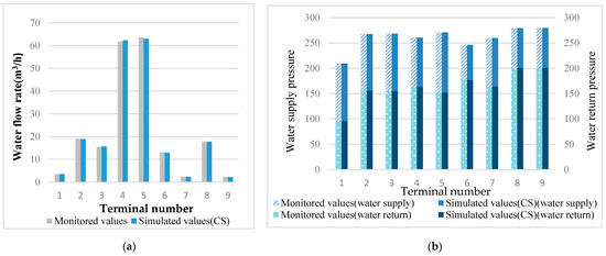 It was found that the optimal identification of the pipe resistance characteristic coefficients based on the cuckoo algorithm was largely consistent with the actual monitored values after being substituted into the original hydraulic model. As depicted in Figure 7a, the minimum difference in flow rate was 0.04 m3/h, while the maximum difference was 0.63 m3/h. As depicted in Figure 7b, the minimum difference in pressure was 0.02 kPa, and the maximum difference was 0.3 kPa. Further discussing the identification results of the pipe network’s resistance characteristics, it can be observed that the average relative error between the monitored and simulated values of the flow rate at each terminal was 1.358%, the average relative error between the monitored and simulated values of the water supply pressure at each terminal was 0.057%, and the average relative error between the monitored and simulated values of the return water pressure at each terminal was 0.089%.