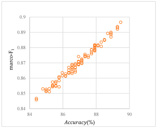At the same time, in order to further evaluate the performance of the first-stage LFD model, two evaluation indicators—accuracy and macro-F1—were selected to evaluate the overall performance of the model in 100 test sets. Figure 8 shows the accuracy and macro-F1 of the BP-neural-network-based leak-stage diagnosis model for the ACWS network on the 100 test sets. The horizontal axis is the accuracy of the LFD model on the test set for each group of experiments, while the vertical axis is the macro-F1 of the LFD model on the test set.