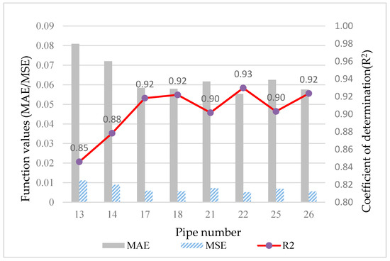 Figure 9 presents the average MAE, MSE, and R2 values for each of the eight pipes under 100 test experiments, with a stable overall performance. The minimum MSE was 0.00518 and the maximum was 0.01117, with the average value being 0.00708, which is less than 0.01; the minimum R2 value was 0.85 and the maximum was 0.93, with the average value being 0.90, which is greater than 0.9.