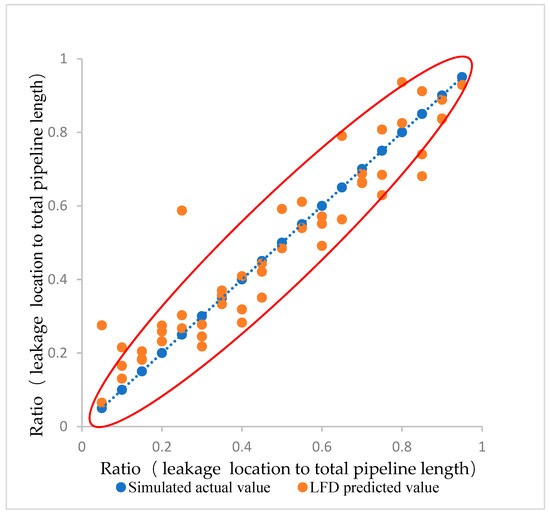 Taking the pipe13 leakage model as an example, the experimental results are presented for one randomly selected group out of 100 test experiments. Figure 10 shows the exact leakage locations and the model-predicted leakage locations in the test set. Except for a few outliers, the majority of the predicted values are close to the actual values, and it can be intuitively inferred that the BP-neural-network-based second-stage LFD model is able to predict the pipe leakage location accurately. Thus, the second-stage LFD model has good diagnostic efficacy.