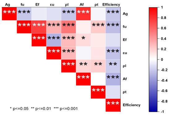 Table 1 summarizes the statistical analyses of all these indicators. The coefficient of variance is abbreviated as COV, while the standard deviation of varying parameters is St. Dev. Statistical analyses were carried out for all eight variables, and descriptive analyses of these parameters are presented in Table 1. The standard deviations values are different among these variables. The standard deviation value for efficiency is less among all, which is 0.1738, and the average mean value is 0.8106. The standard deviation value of Ag is 53,563 mm, whereas their average mean value is 68,208. The Q3 values indicated that 75% of the datasets are equal or < than to this reading. The higher variation values indicate a greater spread of the datasets. Correlation analyses were also carried out to find out the significance level among the variables (Figure 1). When the p-values are <0.05, then it shows a statistically significant result among the two variables. If the p-value is >0.05, then it will not be a statistically significant result and we reject it. The probability values of all parameters are summarized in Figure 1.