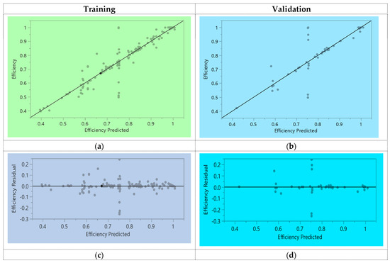 Training and validation graphical profile can also be seen in Figure 5a,b showing relationship between actual efficiency calculate through DEA and predicted efficiency through ANN. In addition to that, Figure 5c,d shows comparative relationship related to residual profile for training and validation data.