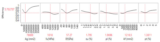 The prediction profiler plot has been performed on the various parameters using artificial neural network modelling, as shown in Figure 6. The given figure showed the relationships among different variables. The first row (from the left) of the prediction profile showed the efficiency of the model against the cross-sectional area of the columns. It has been observed that initial efficiency was reduced with increasing the cross-sectional area of the column, whereas it tends to increase with an increase in its value. The relationship between tensile strength and the efficiency of axial strength is seen in Figure 6 in the second row (from the left). It was observed that fu values were increased with a decrease in the efficiency range. Similarly, the interaction of efficiency and Ef (elastic modulus) is presented in the third row (from the left), and it was observed that at the start, the efficiency value had decreased with the change in Ef, and afterwards, there was a significant increase in efficiency value observed with increasing Ef values. The relationship of efficiency against ultimate tensile strain and longitudinal bar ratio was plotted in the fourth and fifth rows are given below in Figure 6. There is a decreased trend in efficiency values recorded with an increase in their percentage values, i.e., εu (%) and pl (%). There is an increasing trend observed between efficiency and Af values, which can be seen in Figure 6, in the second row from the right. In the last row from the left, there is a plot between efficiency and pt (%). It can be observed from their plot that initially, there were showed decreased efficiency values with increasing pt percentages. Afterwards, there is a significant increase in efficiency was recorded with increasing pt percentages as per the previous dataset obtained from different research works.