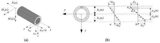Motivated by the investigation on elastic–plastic bending of beams conducted by Štok and Halilovič [33], we assume that a straight circular steel tube with an area of cross section A(x) is mainly subjected to the bending moment My(x), Mz(x) and uniaxial force N(x), as shown in Figure 1a. As the tube studied in this work is slender (ratio l/D > 5, where l is the length of the tube and D is outer diameter for cross section), the shear stress is too small compared with the normal stress such that it can be ignored (i.e., τxy(x, y, z) = τxz(x, y, z) = 0). Then the governing equations of stress state distributed on the cross section can be identified according to the Bernoulli–Navier hypothesis on planarity and respective perpendicularity for cross section [34], which reads: