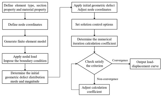 The analysis process on the static stability of the reticulated shell using the stochastic defect mode method is illustrated in Figure 2. The simulation is carried out based on the software ANSYS. It can be seen in Figure 2 that the finite element model of structure is established firstly. Then a reasonable initial geometric defect distribution pattern and magnitude are applied, and the appropriate numerical iterative calculation coefficients are set. The main factors to determine the convergence numerical method are the quality of grids, the reference arc length radius factor and the load steps. Since the grids are fixed once the finite element model is generated, if the numerical iteration is not convergent, the calculation coefficients involving the reference arc length radius factor and the load steps need to be adjusted until the solution satisfies the criterion. Finally, output the load-displacement result.
