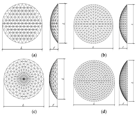 In the present paper, for the four types of commonly used, single-layer reticulated shells (as shown in Figure 3) are investigated through geometric and material nonlinear analysis within the random defect mode method, with the magnitude of δ = L/1000, L/900, L/800, L/700, L/600, L/500, L/400, L/300, L/200, and L/100 (δ is the IGDM). Parameters of single-layer reticulated shells are shown in Table 1. Steel with the elastic modulus E = 2.06 × 106 MPa, the Poisson ratio ν = 0.3 and the yield strength fy = 240 MPa were determined as the material properties of calculation models. The roof static load is 0.8 kN/m2, and the roof live load, which is considered the whole span arrangement, is 0.5 kN/m2.
