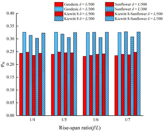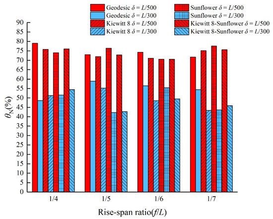 It is clear in Table 3 that when the IGDM is less than L/500, with the increase in the IGDM, the decrease in the MAS with percentage and the increase in the MAS with RBA are slow. While after the IGDM is greater than L/500, with the increase in the IGDM, the drop of the MAS with percentage and the rise in the MAS with RBA are sharp. It indicates that with the rise in the IGDM, the SFS at SCS changes from the film internal force to the bending internal force. In this paper, the dual-control principle is proposed to judge the SFS at the SCS. To be specific, when the average of the percentage of MAS to the effective member is larger than 0.70, and meanwhile, in these members, the average of RBA is not larger than 0.25, and the SFS is dominated by the film internal force. As it is mentioned in Section 4.1, the SFS of the reticulated shell can be interpreted to be dominated by either the internal film force or bending moment, depending on the percentage of the MAS member (namely, the value of θN in Equation (30)). When considering the allowed IGDM for the reticulated shell in practical engineering, it is safe to control the SFS of the structure to perform as an internal film force. As it is illustrated in Table 3, before the IGDM δ reaches the L/500, the θN for all the four types of reticulated shell structures (Geodesic, Kiewitt 8, Sunflower, and K8-Sunflower) decreases steadily and the value of it remains beyond 70%. After that, the value of θN drops remarkably with the rise in IGDM δ, and its value falls beneath 50%, and to 20% finally. This means that the SFS of the shell structure changes to be dominated by the bending moment.